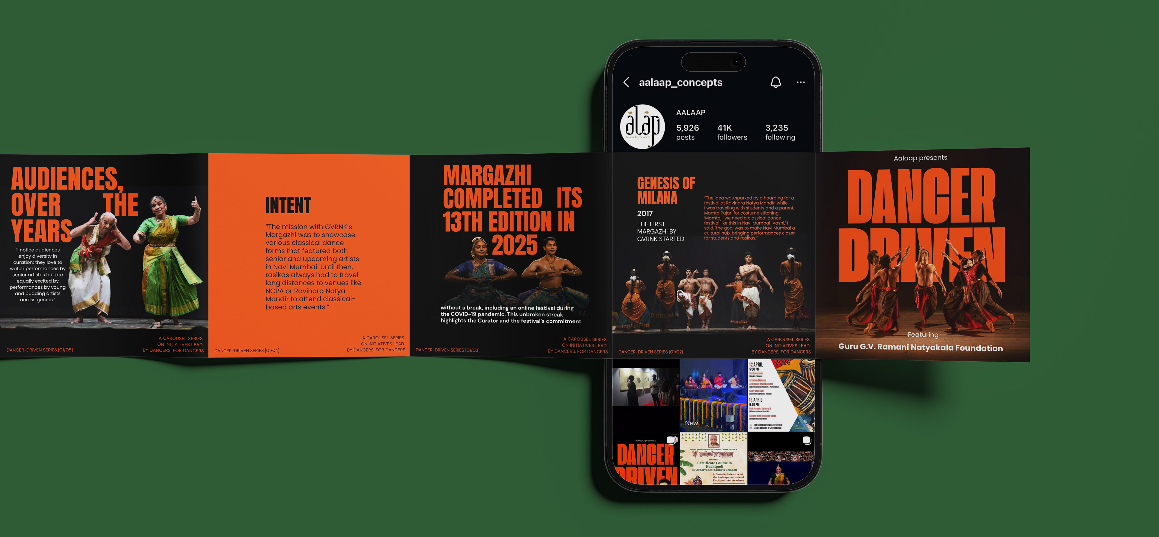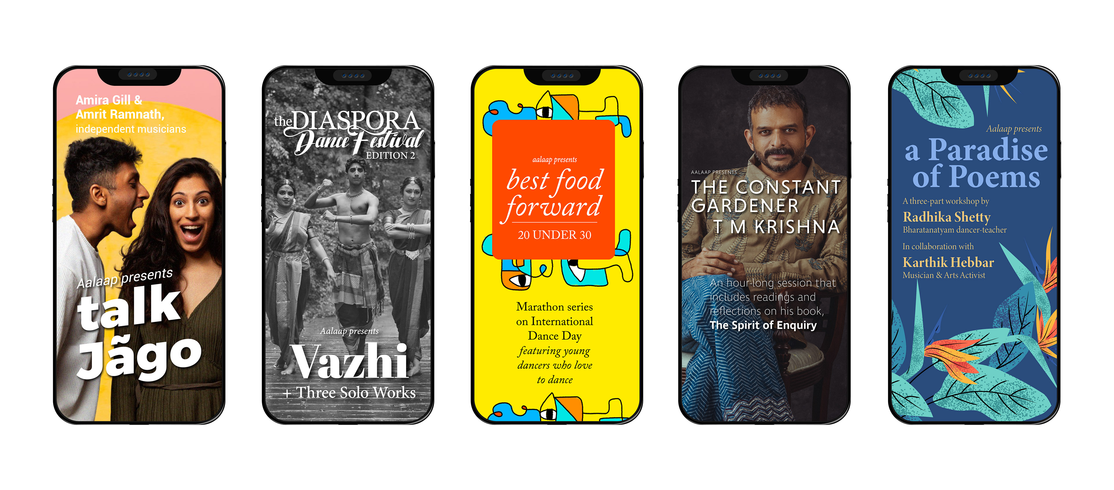 In the years of the pandemic, we had the honour to give visual identity to Aalaap's curation of more than 75 original online events — including artiste conversations and interviews, mini performances, panel discussions, and workshops. These initiatives were created to uplift our community, nurture connection, and keep our shared spirit alive despite the challenges of lockdown, loss, and grief.