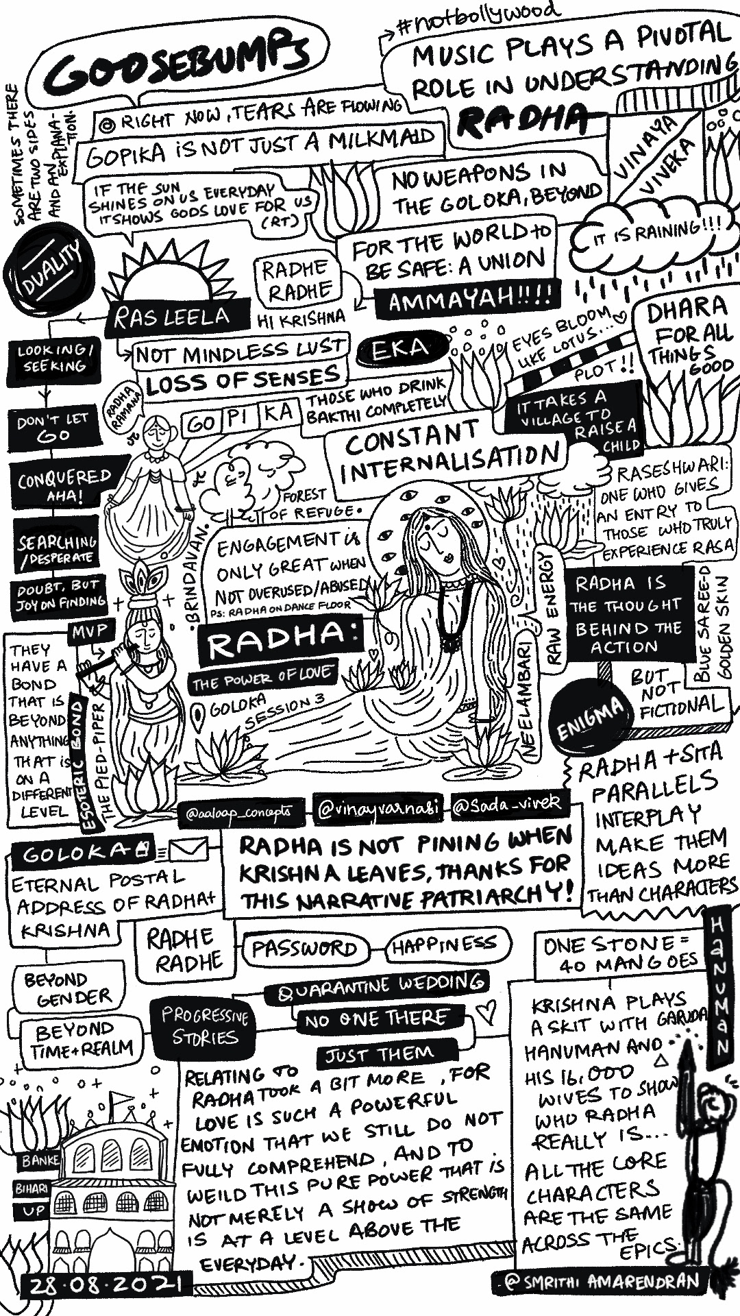 Real-time drawings created during hour-long Zoom sessions by Bengaluru-based storyteller and artist Vinay Varanasi, as he led audiences into an immersive storytelling experience of Aalaap’s Six-Part Goddess Series.