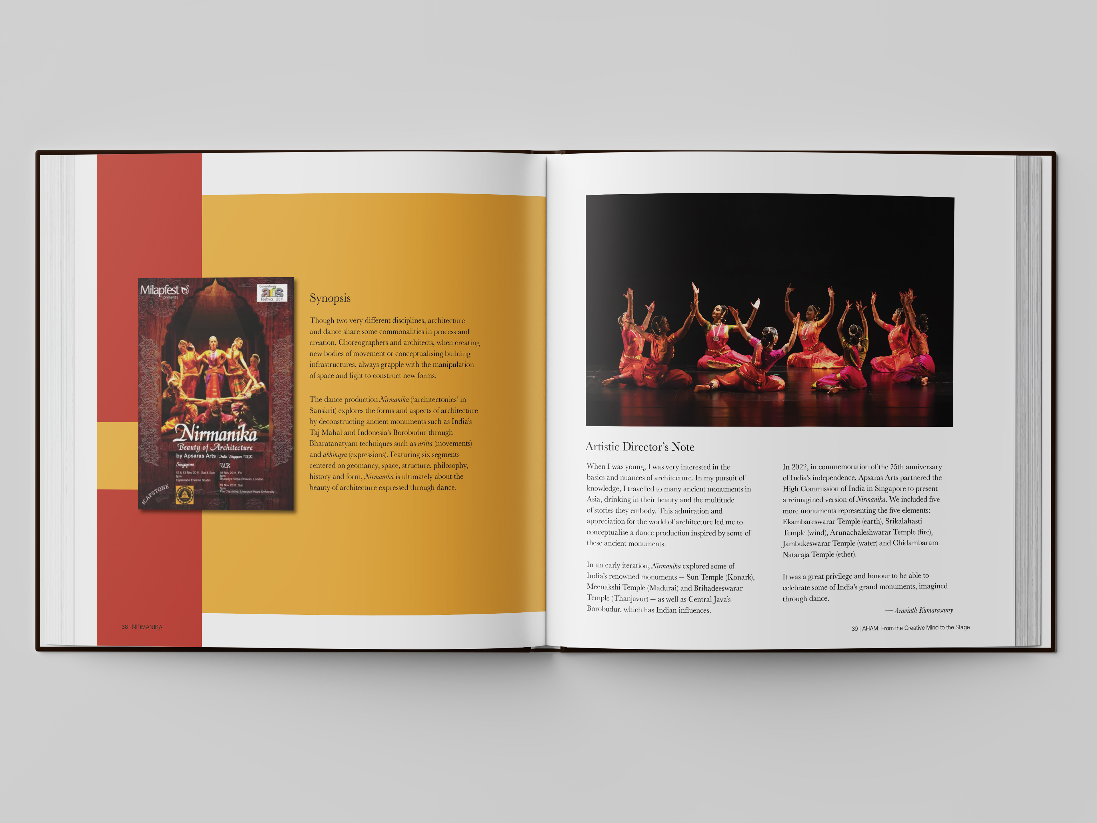 Supported by the National Heritage Board, Singapore, Apsaras Arts Dance Company launched Aham – Works by Apsaras Arts (2000–2023), authored by Artistic Director Aravinth Kumarasamy. A Singapore Cultural Medallion recipient, Aravinth has re-imagined Bharatanatyam as an ensemble art form, leading Apsaras Arts to global acclaim with over thirty-five productions.
