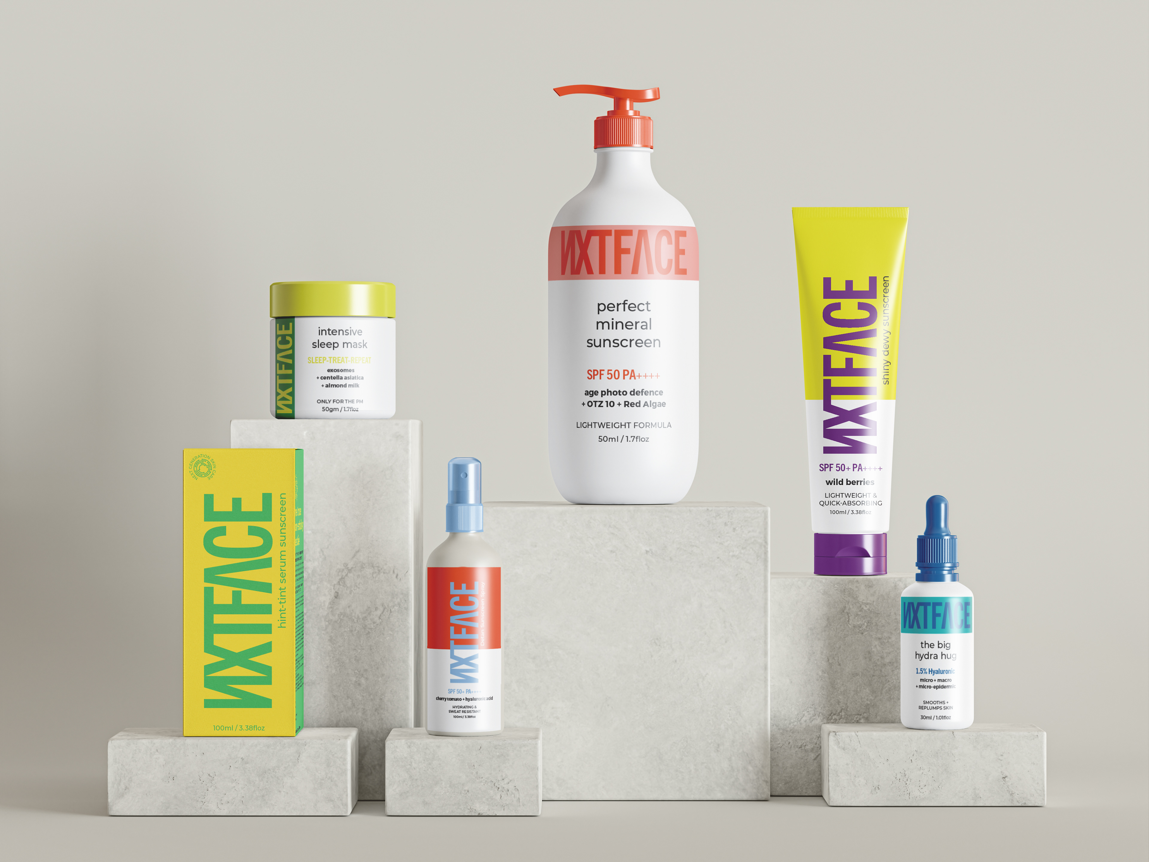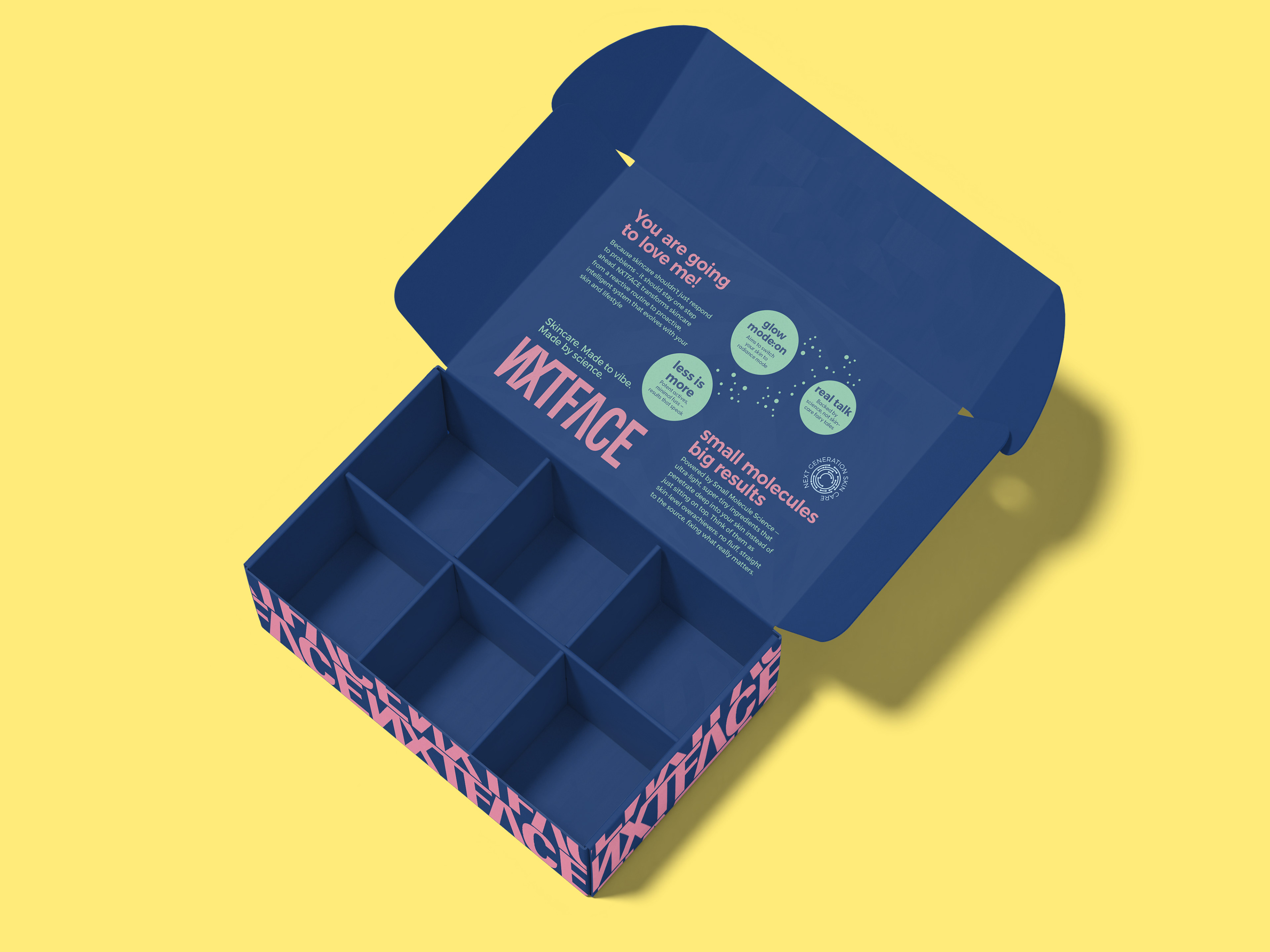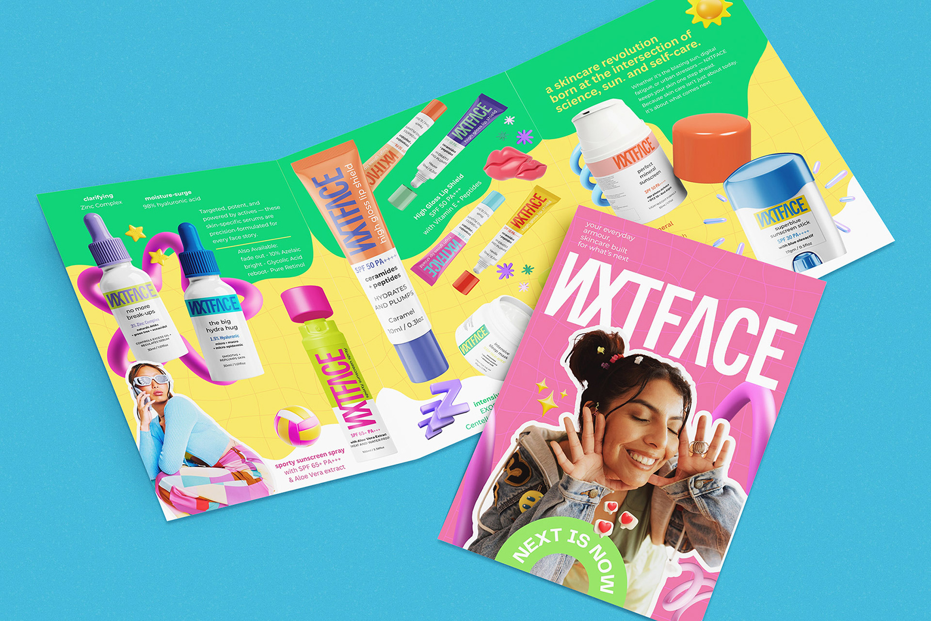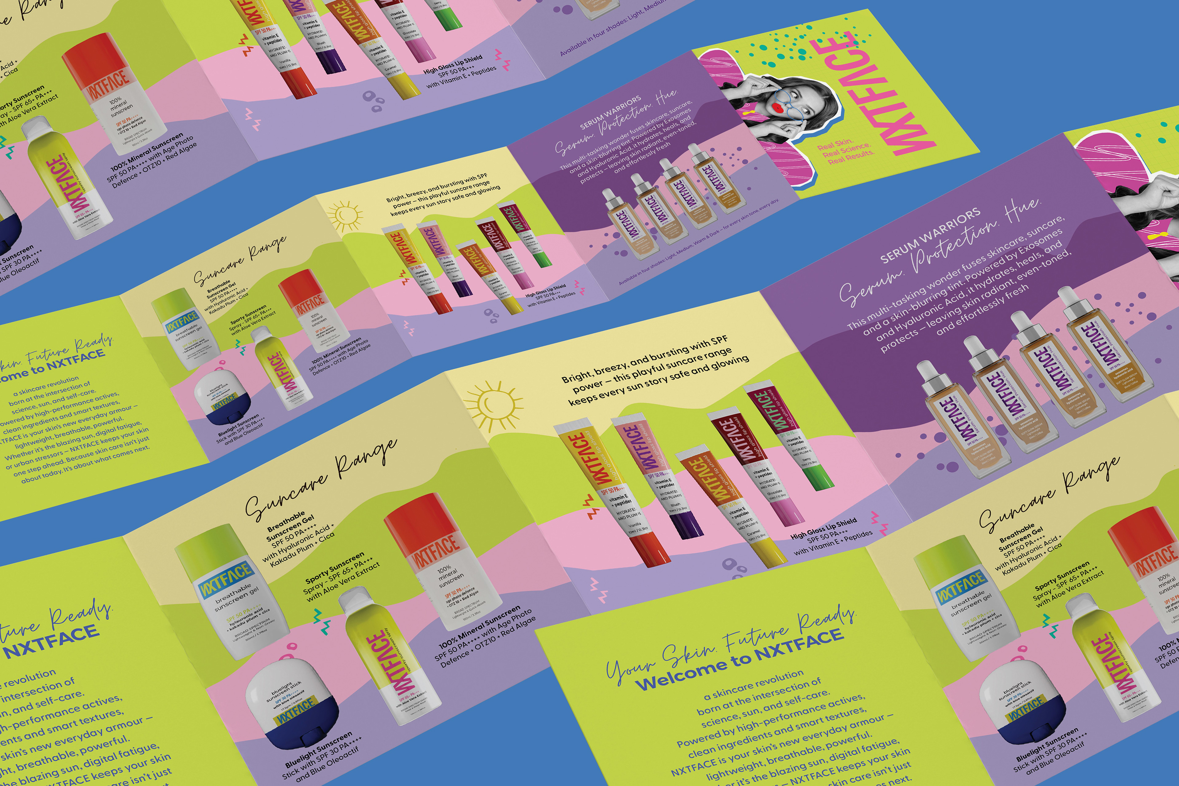 As NXTFACE is positioned as a direct-to-consumer brand , we did not want to just design for skincare — we wanted to design a conversation, a more intentional approach, combining casual banter with pop-colours. We wanted to arrive at a point that skincare should not just be routine, but more of dialogue.